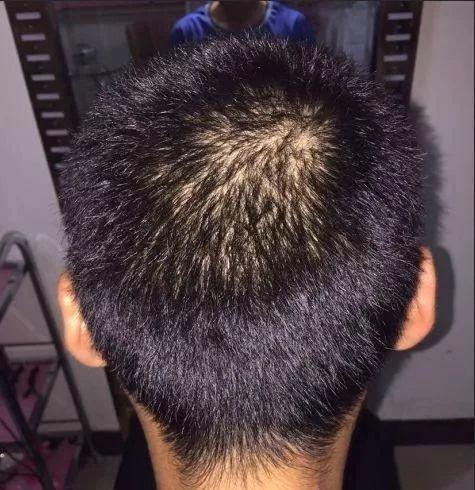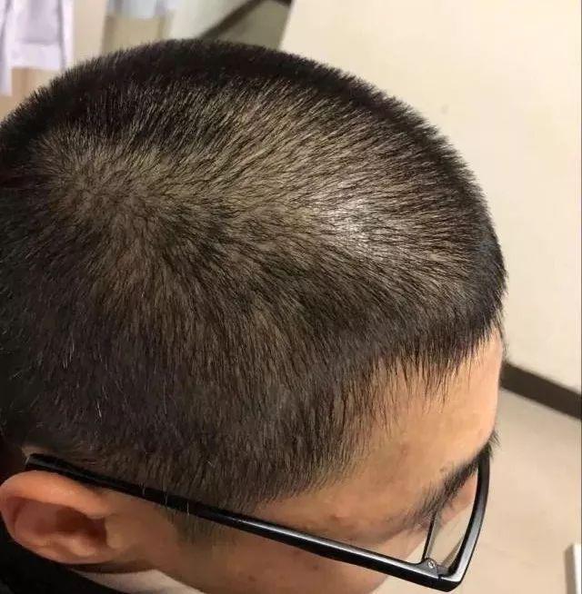 李先生主要是前头顶头发稀疏,特别在灯光的映射下,稀疏部位非常明显。↑
