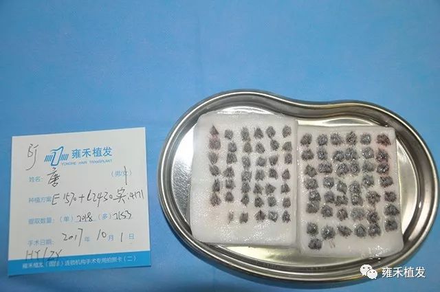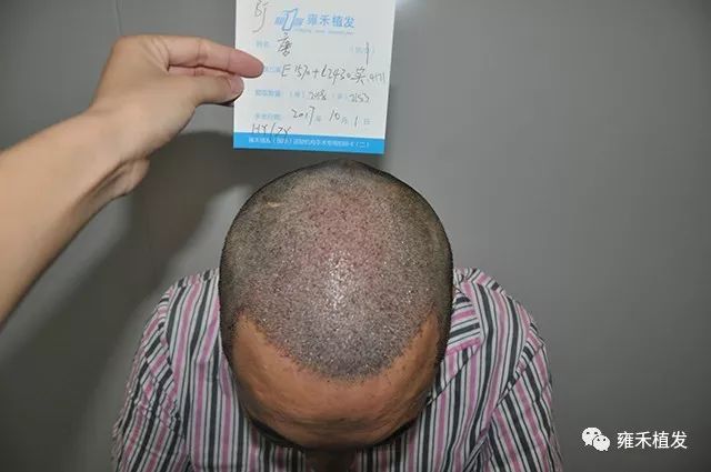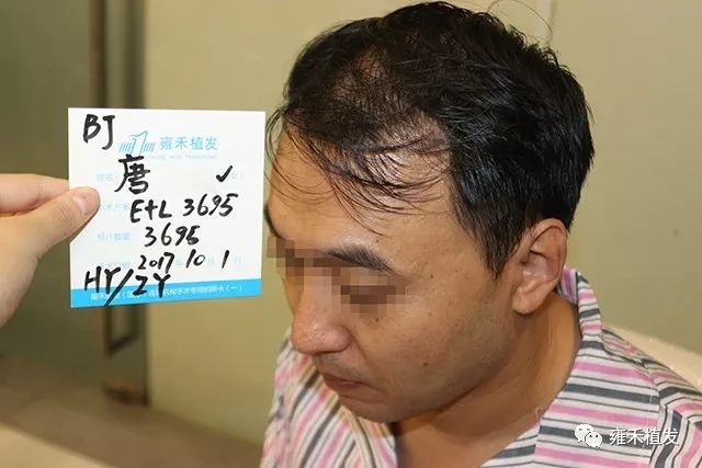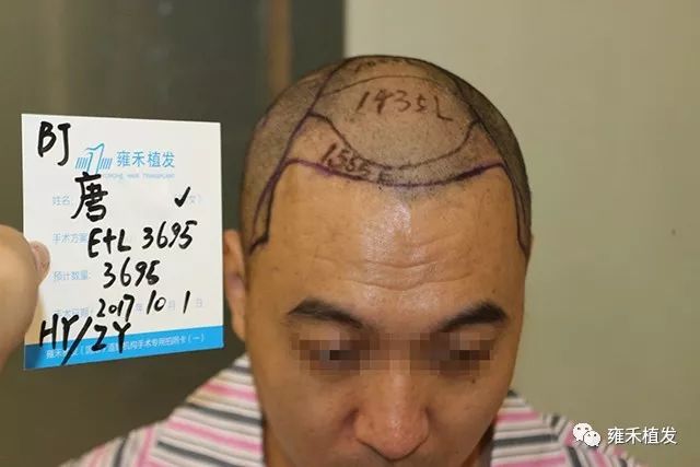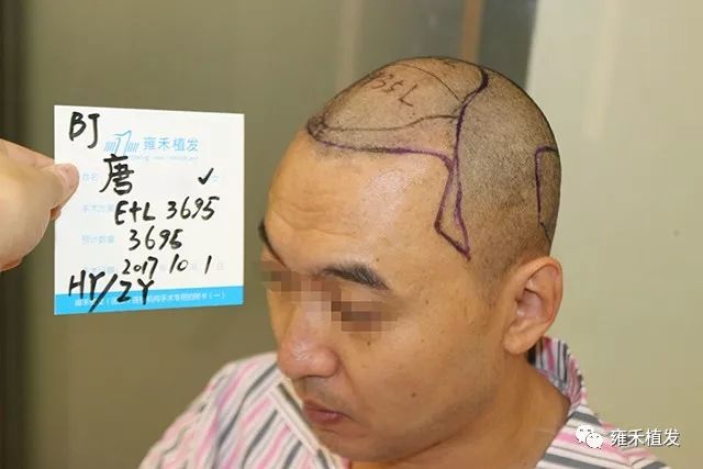 2017年10月1日,北京雍禾为唐先生种植4171单位,含单根头发的毛囊单位2018,含多根头发的毛囊单位2153;本来术前预估种植3695单位,实际上多取种476单位。前面说了,他的脱发以整体稀疏为主,对应地就以LATTICE植发为主,辅以FUE。单次植发突破4000单位,说明大面积脱发啊。如何从自卑走向自信唐先生就是从“头”开始
