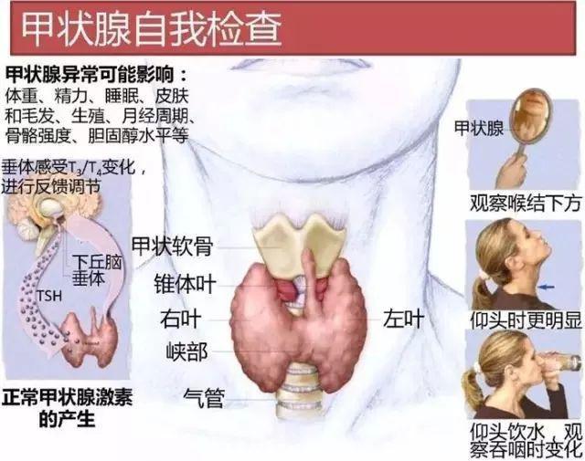 可以做一个简单的自我检查,照镜子观察喉结的下方,仰头会看的更加明显,一边喝水一边观察自己吞咽时的变化。