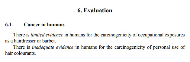 世界卫生组织下属的国际癌症机构IARC的结论是:人类身上的有限证据显示,有关理发师的职业接触具有致癌性。没有足够证据显示个人使用染发剂有致癌性。[1]